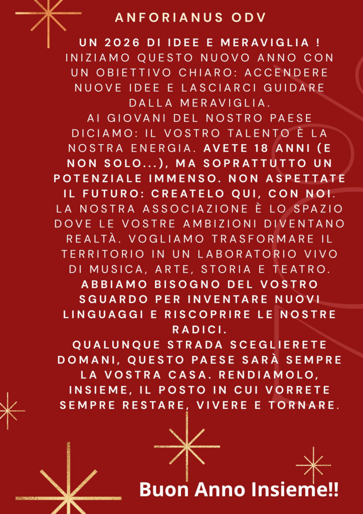 Nuovo Anno, Nuova Storia da scrivere! Con un messaggio speciale per i GIOVANI, i nuovi protagonisti delle nostre Attività…Musica, Arte, Storia, Teatro…e non solo! ” Tutte le informazioni ai nostri contatti (mail info@anforianus.it – telefono 3397829641)